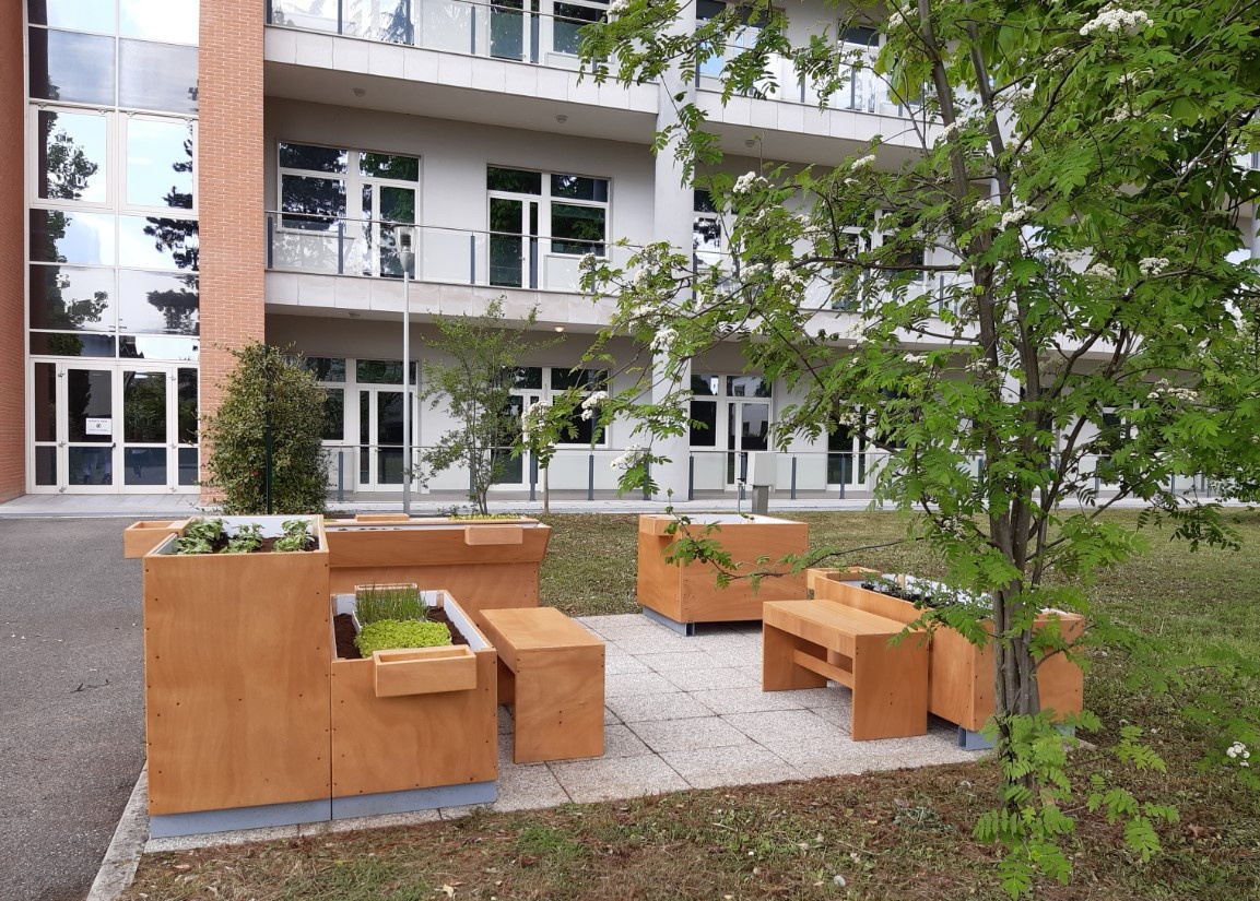 Bei IMFR in Udine artikuliert sich das Projekt für Garten-Therapie in einem organisierten Bereich mit hochgelagerten Wannen verschiedener Höhe, die dank ihrer ergonomischen Form die Pflege der Pflanzen am Boden auch für Personen mit verringerter Mobilität erlaubt, die die Tätigkeit in Sitz- oder Stehposition tätigen können.