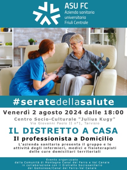 Vinars ai 2 di Avost aes 18:00 tal Centri Socioculturâl “Julius Kugy” di Tarvis si tignarà la prime serade di une schirie di incuintris informatîfs clamâts #seratedellasalute inmaneâts de Comunitât di Mont dal Cjanâl dal Fier e de Valcjanâl, in colaborazion cul Distret Sociosanitari dal Glemonàs Cjanâl dal Fier Valcjanâl.
