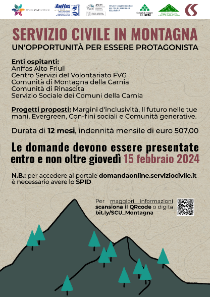 Graciis a un lavôr di condivision e di colaborazion fra CSV F-VJ, Comunitât di Mont de Cjargne, Servizi Sociâl dai Comuns de Cjargne, Anffas Alto Friuli e Comunità di Rinascita cul supuart de ACLI F-VJ, a son stâts fats bogns 12 progjets di Servizi Civîl Universâl pai zovins dai 18 ai 28 agns, di fâ in Cjargne.