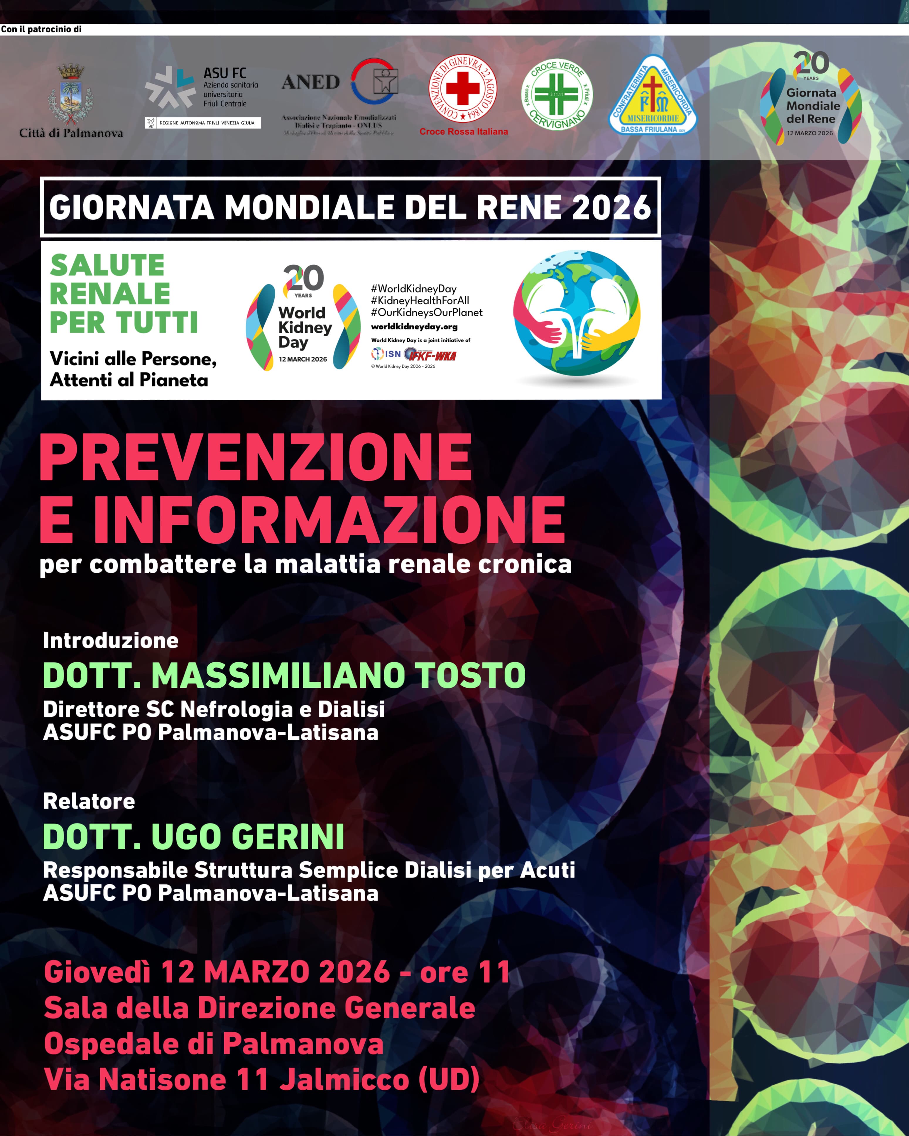 Alle ore 11.00 presso la Sala della Direzione Generale (Ospedale Palmanova, via Natisone 11 – Jalmicco) si terrà una conferenza aperta a tutti sul tema annuale "Salute renale per tutti. Vicini alle persone, attenti al Pianeta."