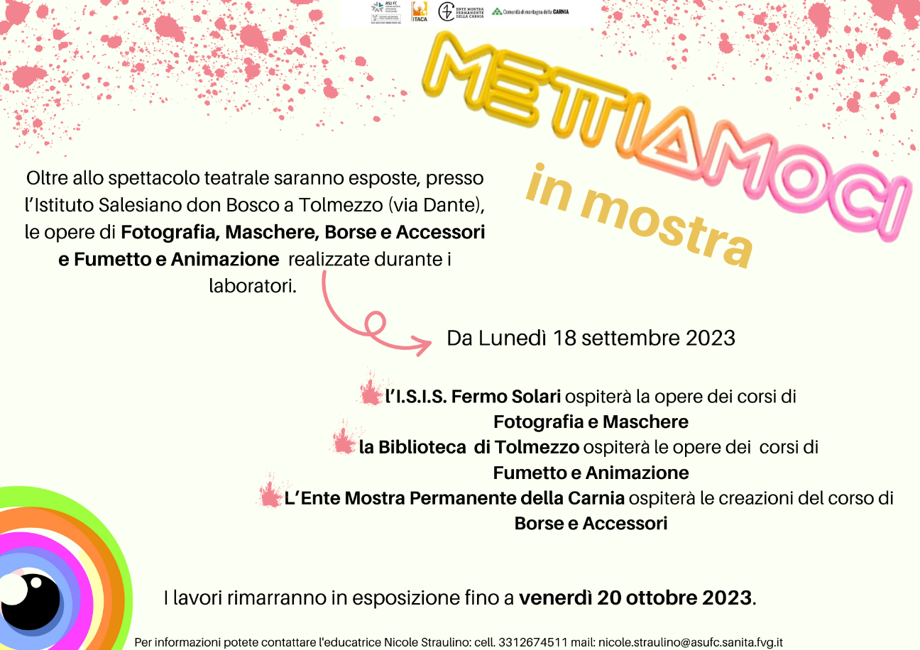 Domenica 17 settembre 2023 dalle ore 16.00, presso il cortile dell’Istituto Salesiano don Bosco di Tolmezzo saranno esposte le opere realizzate nei