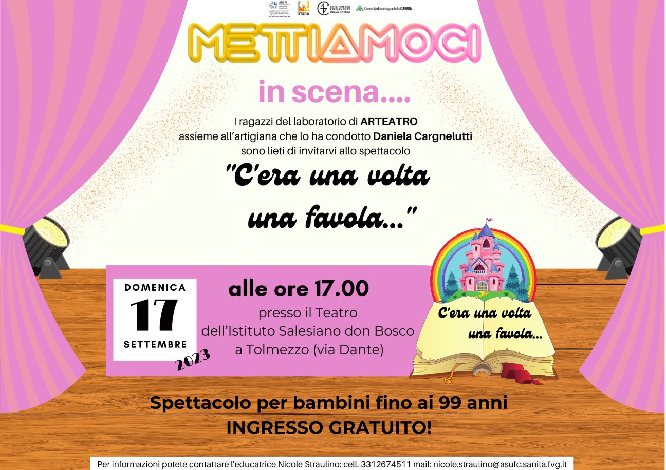 Domenica 17 settembre 2023 alle ore 17, presso il teatro dell’Istituto Salesiano don Bosco di Tolmezzo, andrà in scena lo spettacolo ideato dai ragazzi, assieme all’artigiana Daniela Cargnelutti, durante il laboratorio di “Arteatro” dal titolo “C’era una volta una favola” all’interno del progetto “Mettiamoci a Fuoco” - estate 2023.