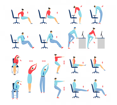 È importante considerare in tal senso, non solo la corretta ergonomia nella postazione di lavoro (si rimanda alla brochure aziendale “Ergonomia e postazione di lavoro al VIDEOTERMINALE”, brochure relativa alla sicurezza degli operatori) ma anche la possibilità di introdurre dei piccoli esercizi da svolgere nelle pause, con l’obiettivo di modificare positivamente lo stile di vita professionale.